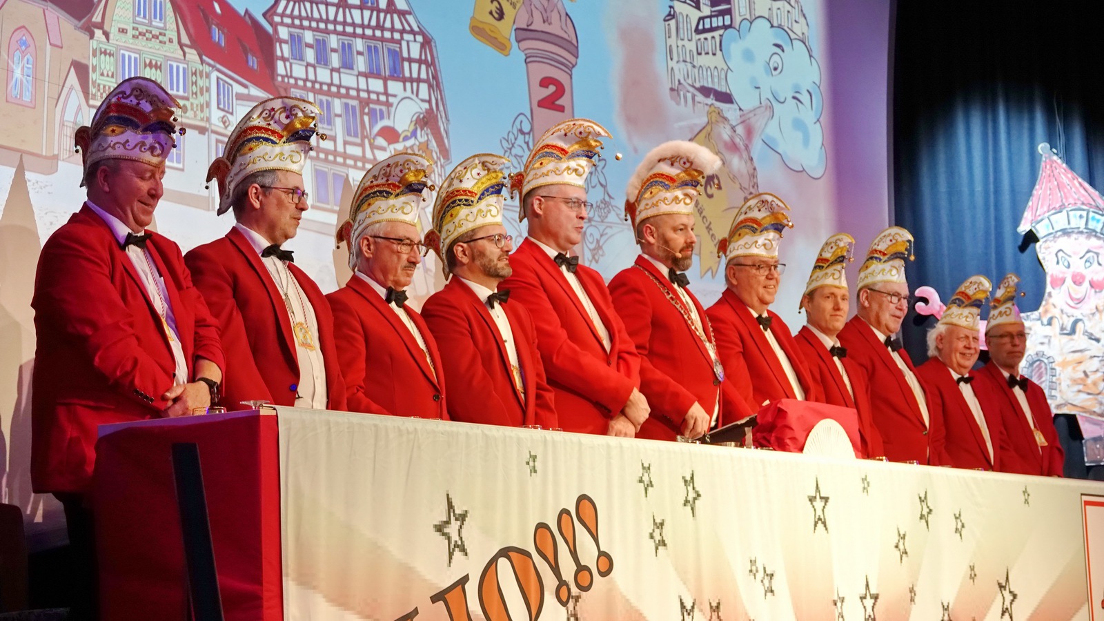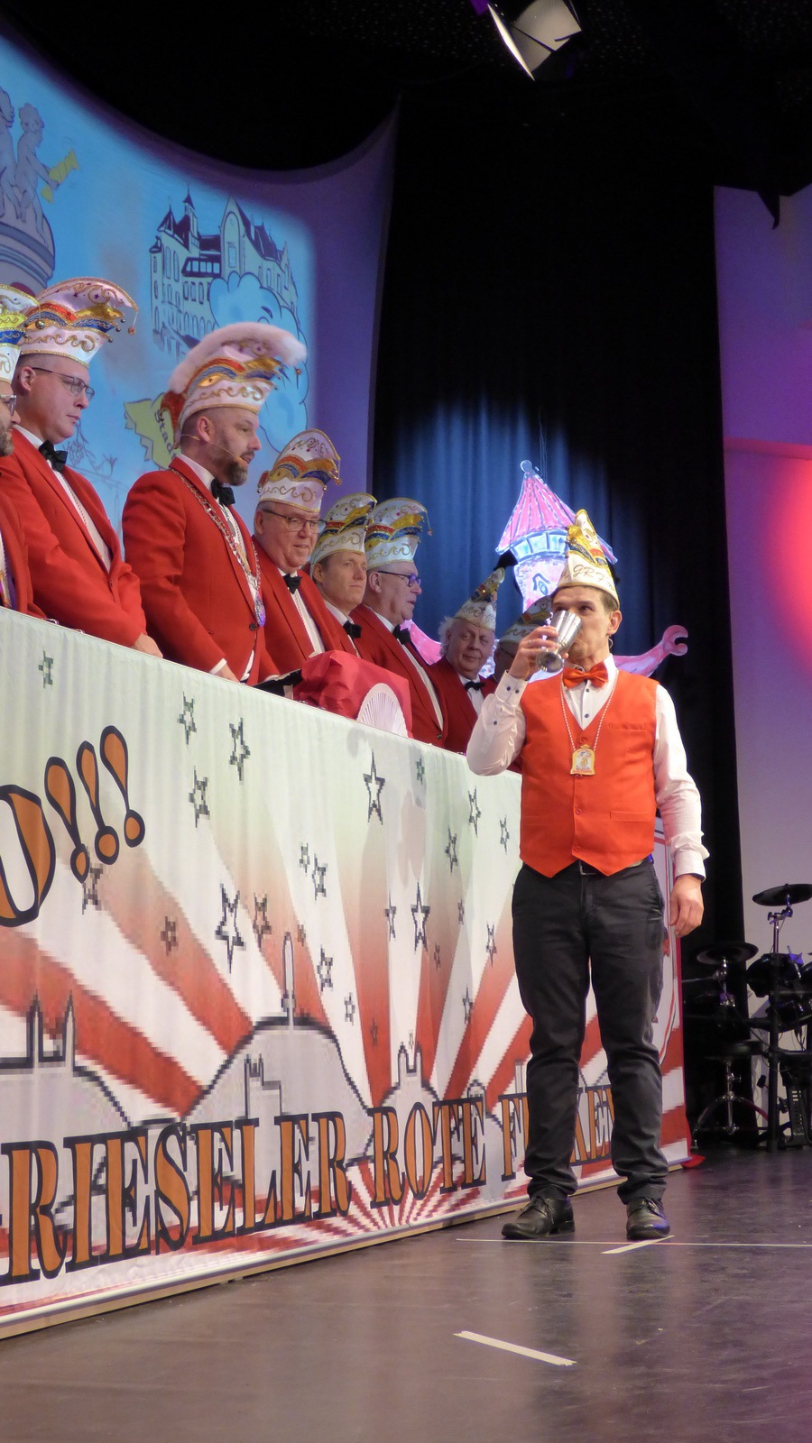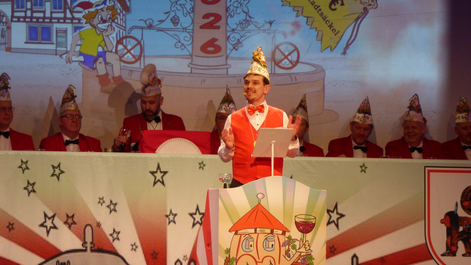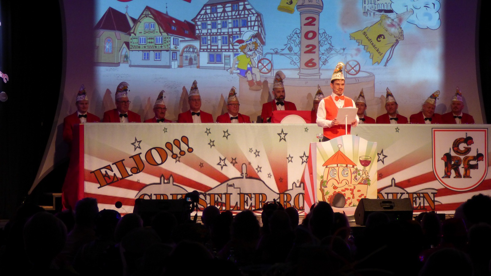 Da hat die Sitzung gerade erst angefangen. Er steht alleine auf der Bühne in der Bütt mit seinem Manuskript und vor ihm ein ganzer Saal voller Zuschauer die närrisch unterhalten werden wollen. Das Ganze in einer Zeit in der die halbe Welt durchdreht und Autograten, Diktatoren und Möchtegern-Könige mit Kriegen und Drohungen die Demokratie und westliche Werte angreifen und verraten. Das ist wahrlich keine einfache Aufgabe. Sie wurde aber wieder gekonnt gemeistert. Das bescheinigt auch unser aufmerksames Publikum mit seinem Applaus unserem Protokoller Rene Egetenmeier.