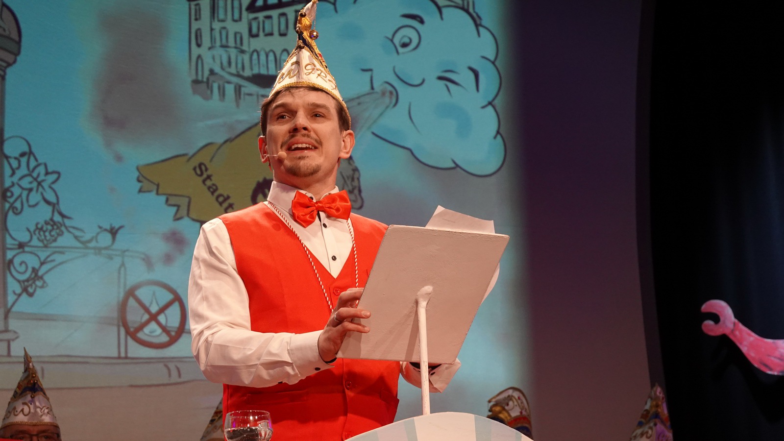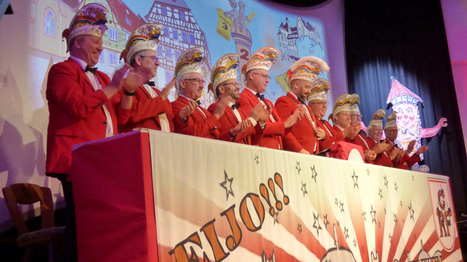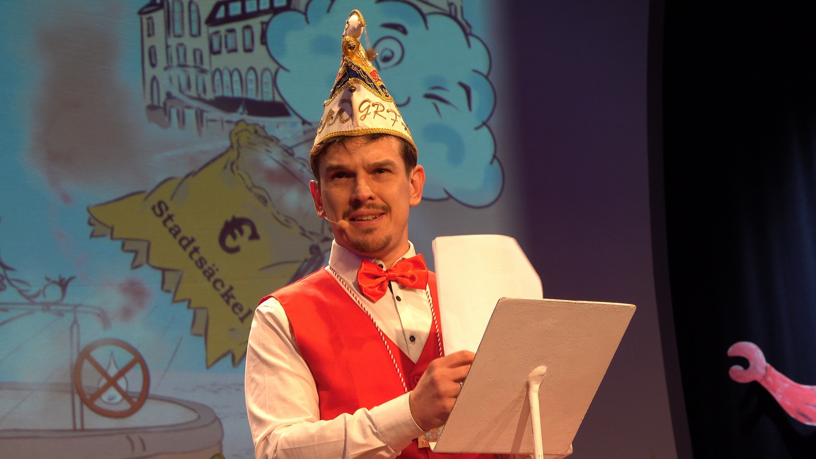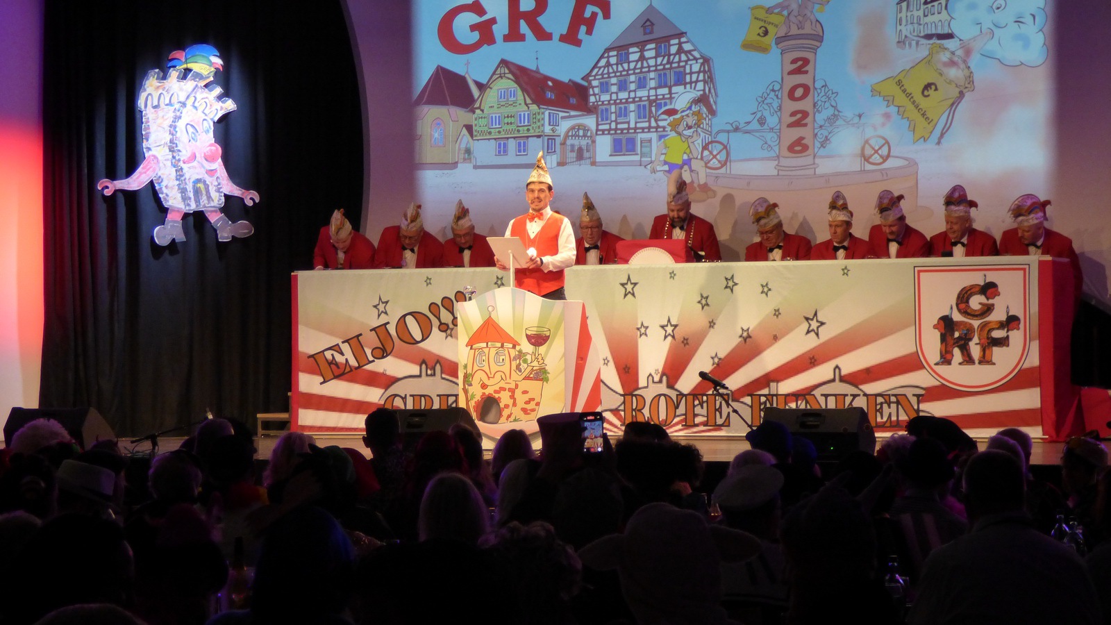 Da hat die Sitzung gerade erst angefangen. Er steht alleine auf der Bühne in der Bütt mit seinem Manuskript und vor ihm ein ganzer Saal voller Zuschauer die närrisch unterhalten werden wollen. Das Ganze in einer Zeit in der die halbe Welt durchdreht und Autograten, Diktatoren und Möchtegern-Könige mit Kriegen und Drohungen die Demokratie und westliche Werte angreifen und verraten. Das ist wahrlich keine einfache Aufgabe. Sie wurde aber wieder gekonnt gemeistert. Das bescheinigt auch unser aufmerksames Publikum mit seinem Applaus unserem Protokoller Rene Egetenmeier.